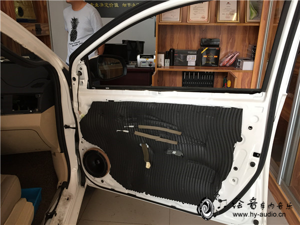 3、门板拆开之后发现车主之前做过一次门板隔音,但是做不不太理想,我们建议车主把换掉,因为车主的预算不高所以,就还是等下过来升级的时候一起弄