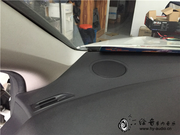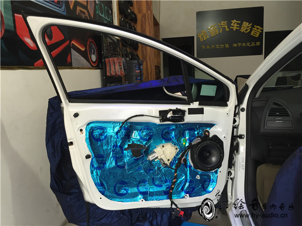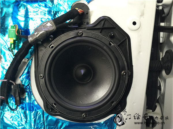 4、一步接着一步,隔音做好开始安装中低音喇叭,整洁的安装,可见喇叭安装好之后的效果图,完全无损安装!