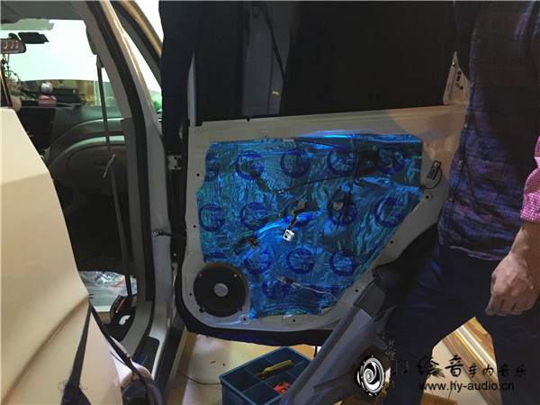 9、全车隔音降噪工程就到这里先结束了,我们在来看一看音响改装吧,前声场喇叭已经安装上去了,完全无损安装,不破坏原车任何内饰结构!