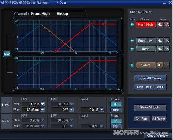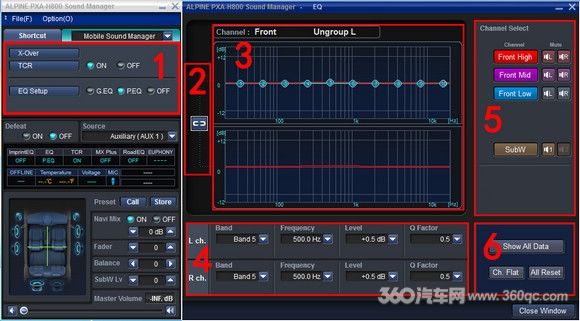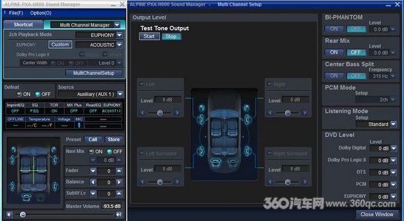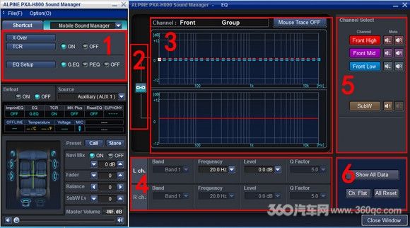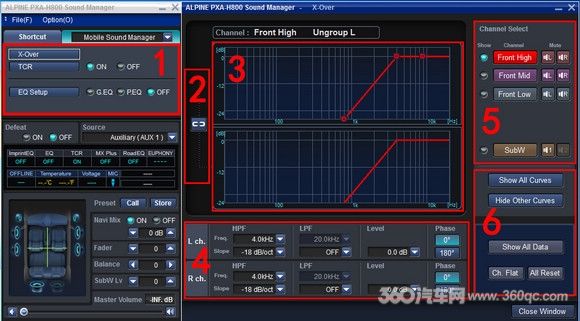如今PXA-H800则继承F No.1系列的超高品质,来到您的面前。PXA-H800处理器,延续及改进了阿尔派的自动调音技术,使用自带的麦克风和调音软件,自动进行声场及均衡调节。个性化人工调试,这款处理器提供了强大的DSP功能,可自由组合的主动式电子分音功能,每个声道独立的31段图示均衡(超重低音为10段),10段参数均衡(超重低音为5段),0-20毫秒的时间延时调整及阿尔派特有的MX音质提升功能。可根据行驶噪音自动进行EQ补偿,内置DTS或杜比5.1声道解码器,并提供两种立体声模拟5.1声道模式。高电平与低电平选择,车上最常用的这两种输入模式在这款处理器来说变得非常简单。使用电脑调试,直观性的界面让操作简单易懂。