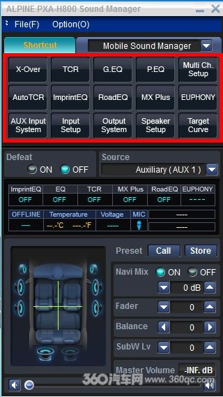 这个界面简单明了的显示了X-OVER分频网络,TCR时间延时,GEQ图示均衡,PEQ参数均衡,MULTI CH.SETUP5.1声道模式,AUTO TCR自动延时调整,IMPRINT EQ 阿尔派的音之印技术,ROAD EQ自动行驶噪音EQ补偿,MX PLUS音质补偿,EUPHONY立体声模拟5.1声道,AUX INPUT SYSTEM输入系统选择,INPUTSETUP输入设定,OUTPUP SYSTEM输出系统选择,SPEAKER SETUP扬声器设定,TARGET CURVE理想曲线模块,直接点击进入调整。中间界面提供了系统状态显示,下方为扬声器增益选项及6个储存设定等