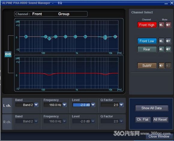 6.EQ调整:当时间延时和分频点调整完毕后,请客户上车试听并按客户听音需求,再进行EQ的调整,由于安装位置的局限性,齿音较为突出,使用参数均衡器以8000HZ为中心点,Q值设为2降低1.5DB使齿音清晰不刺耳,略微降低160HZ为中心频率的125到200使其在大音量时不导致门板共振,仔细聆听后对左右声道的频响做不同的细微调整,使声像漂移减到最小。关于C800调试面板的功能应用,与PC调试来说大同小异,部分功能也无法使用因此不再叙述。