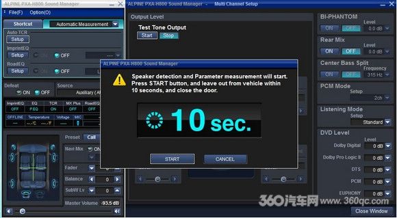 点击START按钮后有10秒的时间供用户关闭离开车厢并关好车门,自动调整完毕后点击ROADEQ,调整方式与上面相同,调整完毕系统会根据行驶环境进行EQ自动补偿,这也算H800比较吸引客户的一个新功能吧,但在调整之前一定要确认周边环境安静,车辆要熄火,关闭所有可能引起噪音的设备,否则效果不理想,笔者曾经为验证这软件花了160元门票带了两个备用电瓶深夜跑到风景区进行调试,总的来说自动调试最大好处是任何位置听音效果相似,但想要得到更好的效果还是请有经验的的技师进行调试。