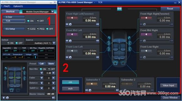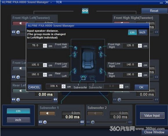 当分频网络初步调整完毕,接下来点击TCR进入延时调整,同样,界面显示出你所选的输出系统,打开图一开关,在左下方提供了CM(厘米)INCH(英寸)选择,在对应的扬声器单元拉选你所需要的距离,软件会自动计算相应的延时数值。点击相应喇叭按钮可以使其静音,便于调整。这个界面提供的是阿尔派的相减延时调整方法,在界面的右下角点击Value Input按钮,这个界面提供了直接输入延时调整法,输入所测扬声器距离系统会自动换算。